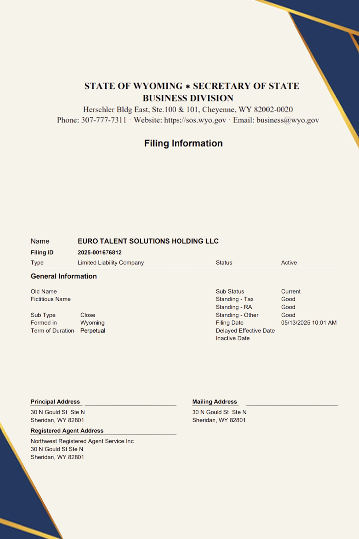 Este documento certifica que Euro Talent Solutions Holding LLC está legalmente registrada en el estado de Wyoming (EE.UU.), con estatus activo y en regla en materia fiscal y legal