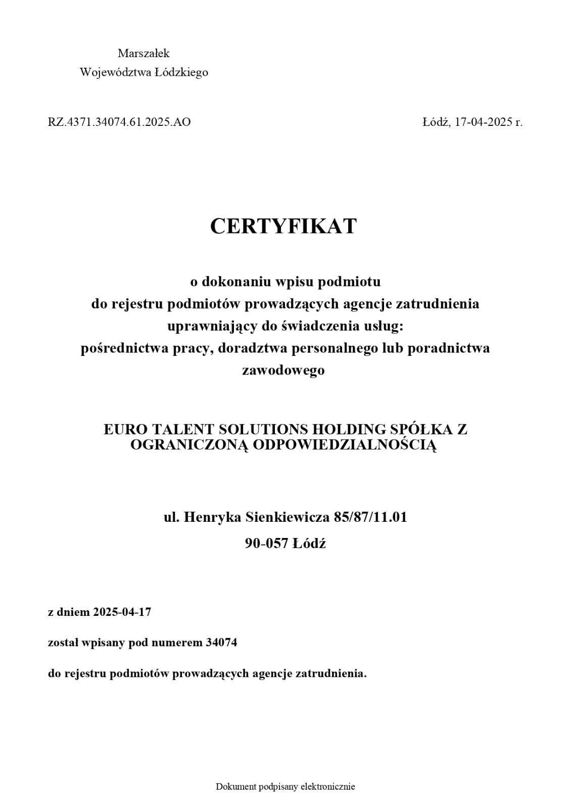Autorización para prestar servicios de: intermediación laboral, consultoría de personal o asesoramiento profesional A partir del 17 de abril de 2025 ha sido inscrita con el número 34074 en el registro de entidades que dirigen agencias de empleo.