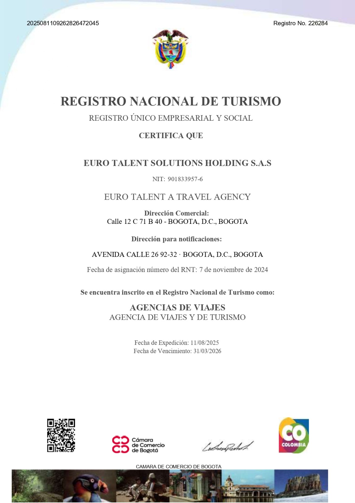 Este documento certifica que EURO TALENT SOLUTIONS HOLDING S.A.S está formalmente inscrita en el Registro Nacional de Turismo (RNT), requisito obligatorio en Colombia para que las agencias de viajes puedan operar de manera legal.